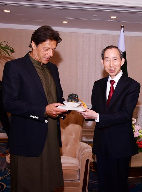 Long Yuxiang, CICCC’s Executive Chairman presents Pakistani Prime Minister Imran Khan with a gift. (Photo: Long Ren)