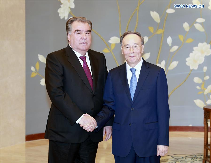 BEIJING, April 28 (Xinhua) -- Chinese Vice President Wang Qishan on Sunday met with Tajik President Emomali Rahmon in Beijing.