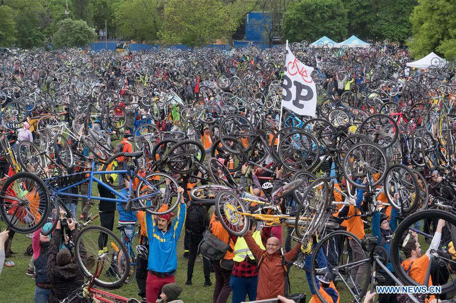 People participate in the "I Bike Budapest" event to promote bicycle as everyday transport in Budapest, Hungary, April 28, 2019. (Xinhua/Attila Volgyi)