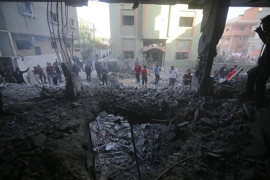 Palestinians inspect the remains of a building that was destroyed during Israeli airstrikes on the southern Gaza Strip city of Rafah on May 5, 2019. At least 12 Palestinians have been killed during Israeli airstrikes on the Gaza Strip since Saturday evening. (Xinhua/Khaled Omar)