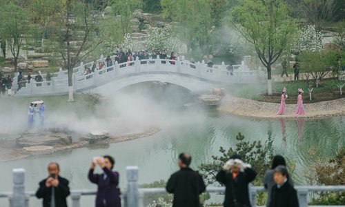 Tourists watch an ancient Chinese costume show at the Yongning Pavilion. Photo: Li Hao/GT