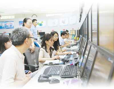 Staff members of Central Meteorological Station follow the develpment of a typhoon. (photo provided by the Central Meteorological Station)