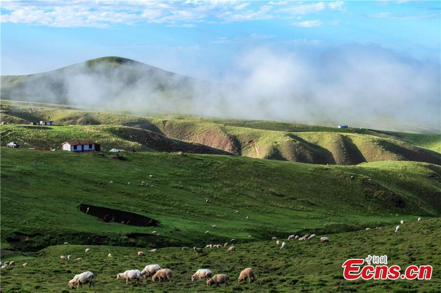 assland at the foot of the Qilian mountains lay shrouded in mist in Sunan Yugur Autonomous County, Northwest China’s Gansu Province. (Photo: China News Service/Yang Shijun)