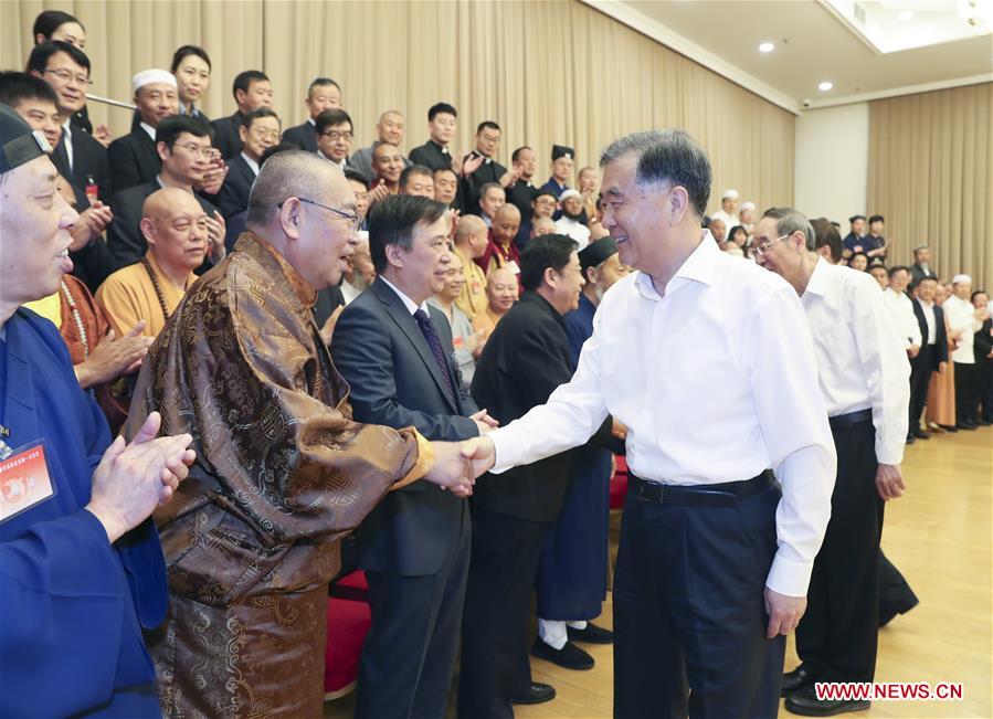Wang Yang (R, front), a member of the Standing Committee of the Political Bureau of the Communist Party of China (CPC) Central Committee and chairman of the Chinese People's Political Consultative Conference (CPPCC) National Committee, meets with delegates attending a session of the China Committee on Religion and Peace (CCRP) in Beijing, capital of China, July 3, 2019. Wang also made a speech at the CCRP session on Wednesday. (Xinhua/Yao Dawei)
