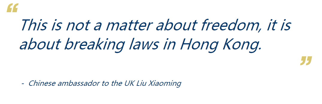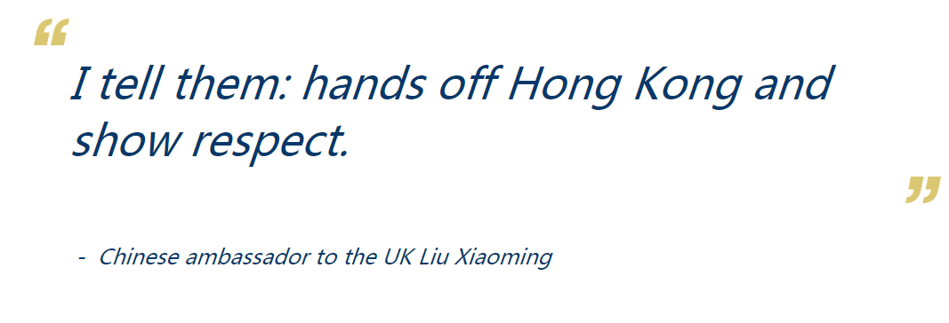 “In the minds of some people, they regard Hong Kong as still under British rule. They forget (…) that Hong Kong has now returned to the embrace of the motherland,” Chinese ambassador to the UK Liu Xiaoming said at a press conference held at the Chinese embassy in London.