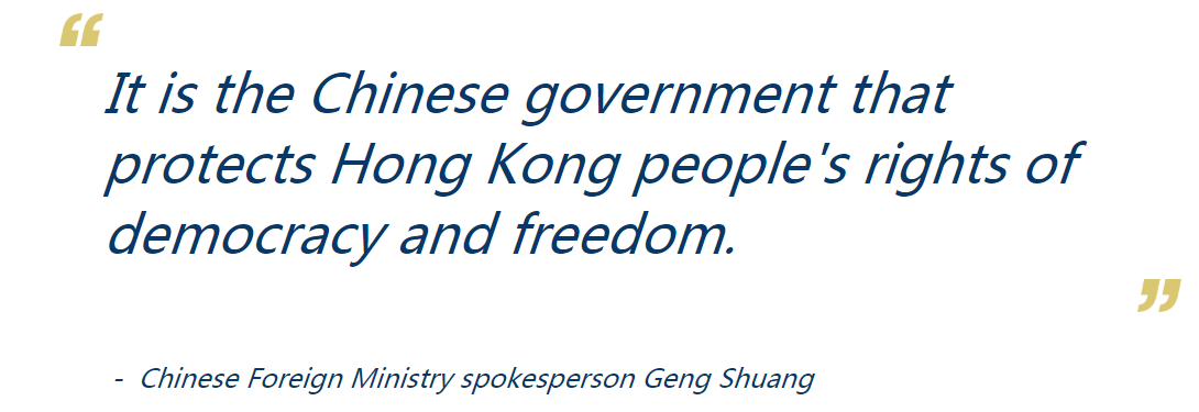 Geng said he wanted to remind Hunt that Hong Kong had no democracy at all during the British colonial rule, and the Hong Kong people had not even the rights to take to the streets to protest.