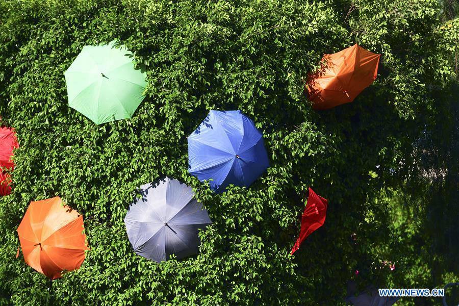 Photo taken on July 13, 2019 shows umbrellas along a street to bring back the popular "Umbrella Street" spectacle in Zabbar, Malta. (Xinhua/Jonathan Borg)