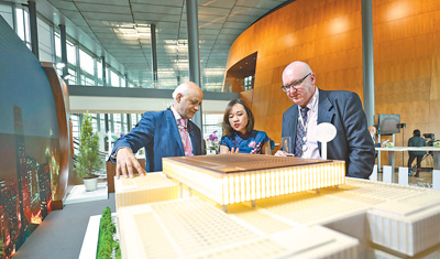 Participants look at the venue model for the 2020 AIIB annual meeting at the exhibition area during the fourth AIIB annual meeting in Luxemburg. (Photo: Zhang Cheng/Xinhua)