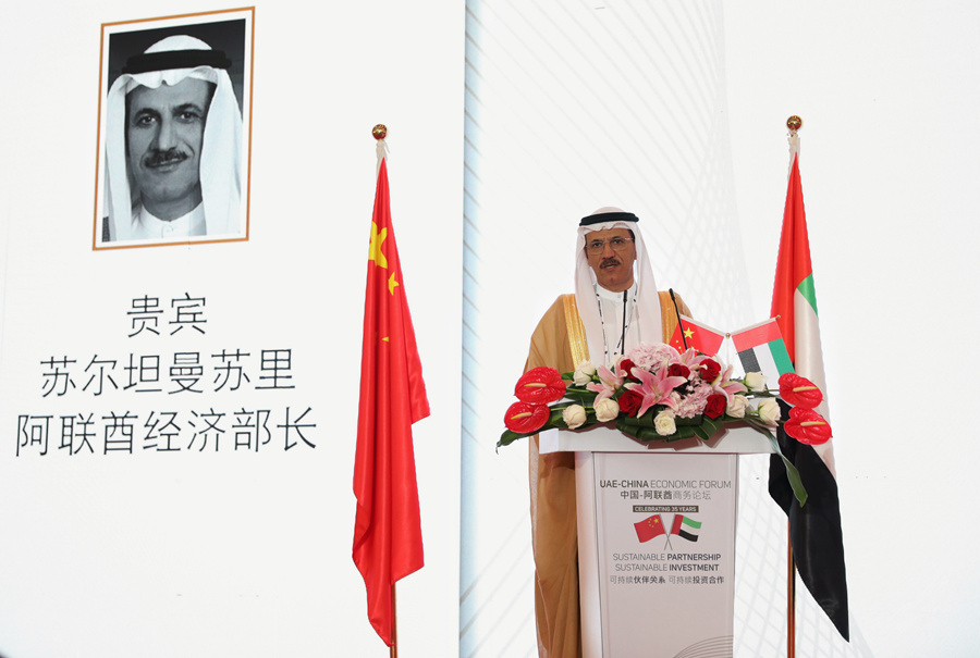 Sultan bin Saeed Al Mansoori, UAE Minister of Economy,addresses the forum. (Photo by Kong Qi)