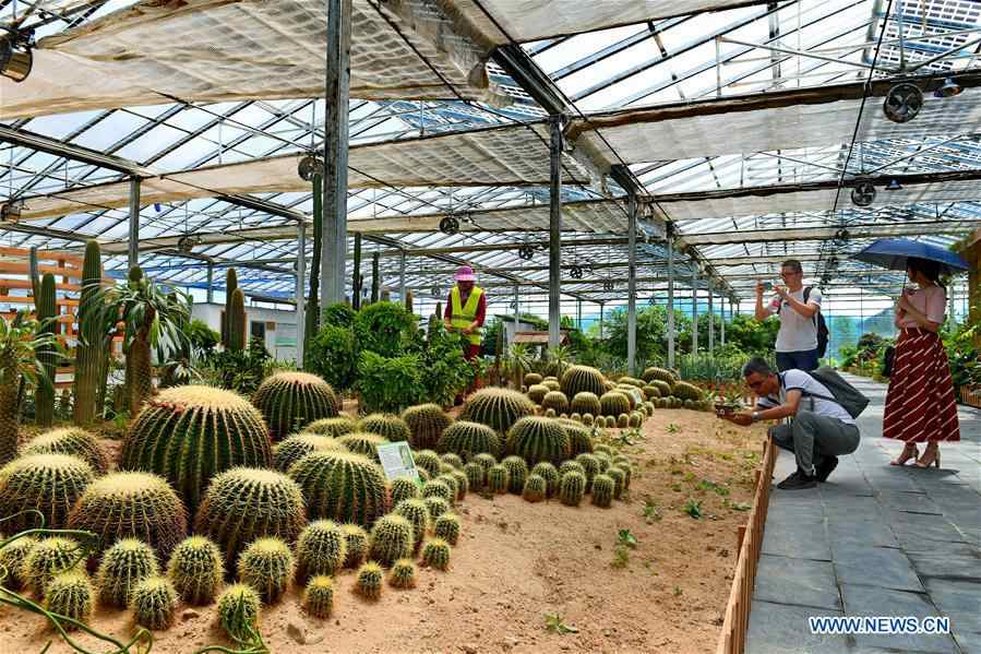 Tourists visit a photovoltaic power station as well as an agricultural garden at Dongping Township in Zhenghe County, southeast China's Fujian Province, July 28, 2019. Local authorities have developed a model to combine photovoltaic panels on the top of the greenhouse with agricultural planting inside the greenhouse in recent years, which benefits the farmers as a new way of poverty alleviation efforts. (Xinhua/Zhang Guojun)
