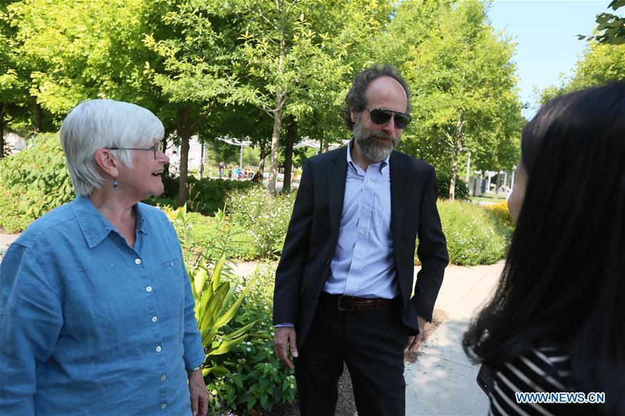 Jan Brown Checco (L), lead artist of the Cincinnati/Liuzhou Paint Out Program, talks with Joe Hamrick (C), chairman of the Cincinnati-Liuzhou Sister City Committee, in Cincinnati of Ohio, the United States, July 25, 2019. Chinese and U.S. artists recently took part in the Cincinnati/Liuzhou Paint Out Program, in which artists from south China's Guangxi Zhuang Autonomous Region were invited to visit Cincinnati for a week. They visited museums and galleries, exchanged art views and techniques with their U.S. counterparts, and presented a joint exhibition. Cincinnati and Liuzhou celebrated their 30th anniversary of the establishment of sister city relations last year. (Xinhua/Zhang Fengguo)