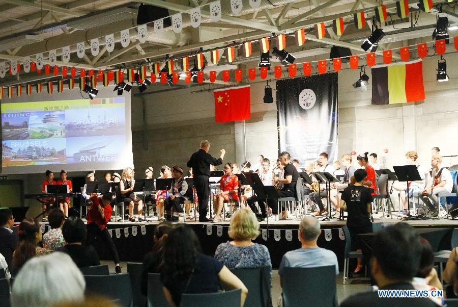 Teenagers from both China and Belgium perform during the "EU-China Youth Music & Art Festival 2019" held in Zandhoven, a small town in north Belgium, July 27, 2019. The "EU-China Youth Music & Art Festival 2019" opened on Saturday night in Zandhoven. Young people and folk artists from Belgium and China gathered for musical performances. (Xinhua/Pan Geping)