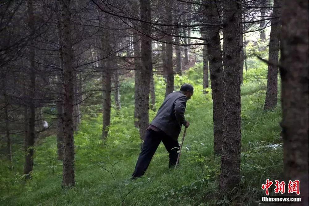 Tian walks in the woodland near Tianchi Lake with a walking stick (Photo/Chinanews.com)