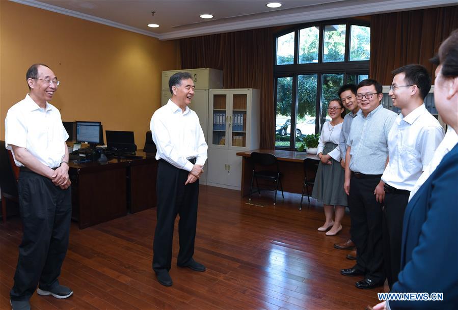 Wang Yang, a member of the Standing Committee of the Political Bureau of the Communist Party of China (CPC) Central Committee and chairman of the National Committee of the Chinese People's Political Consultative Conference, inspects the United Front Work Department of the CPC Central Committee on its party education campaign themed "staying true to our founding mission" on July 31, 2019. (Xinhua/Rao Aimin)
