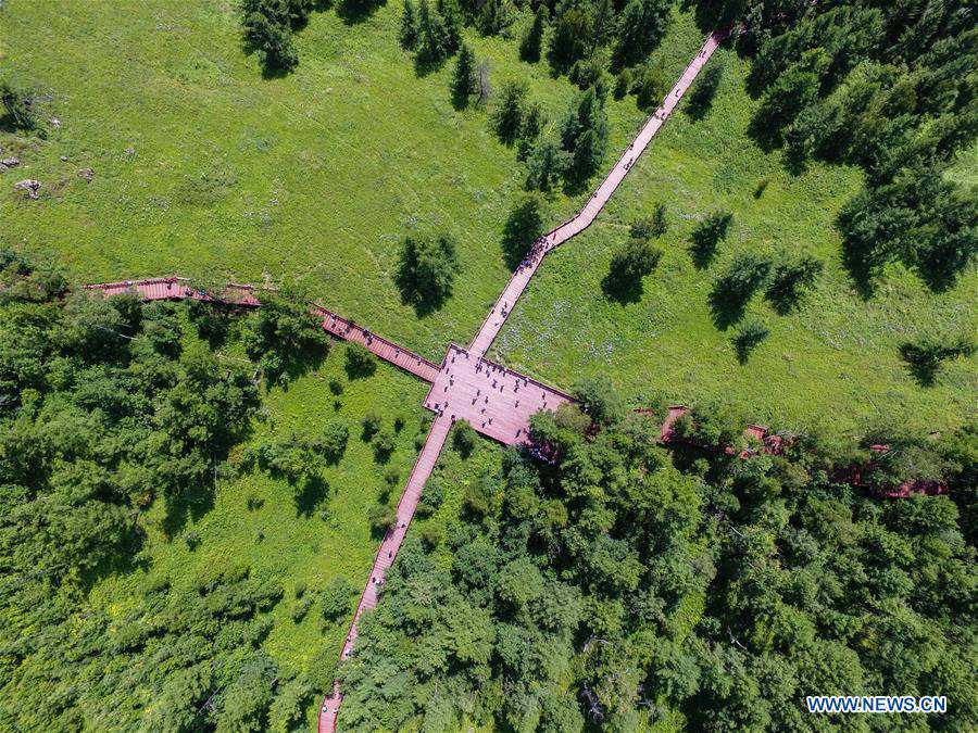 Aerial photo taken on Aug. 14, 2019 shows a walkway at Arxan National Forest Park in Arxan City, north China's Inner Mongolia Autonomous Region. (Xinhua/Liu Lei)