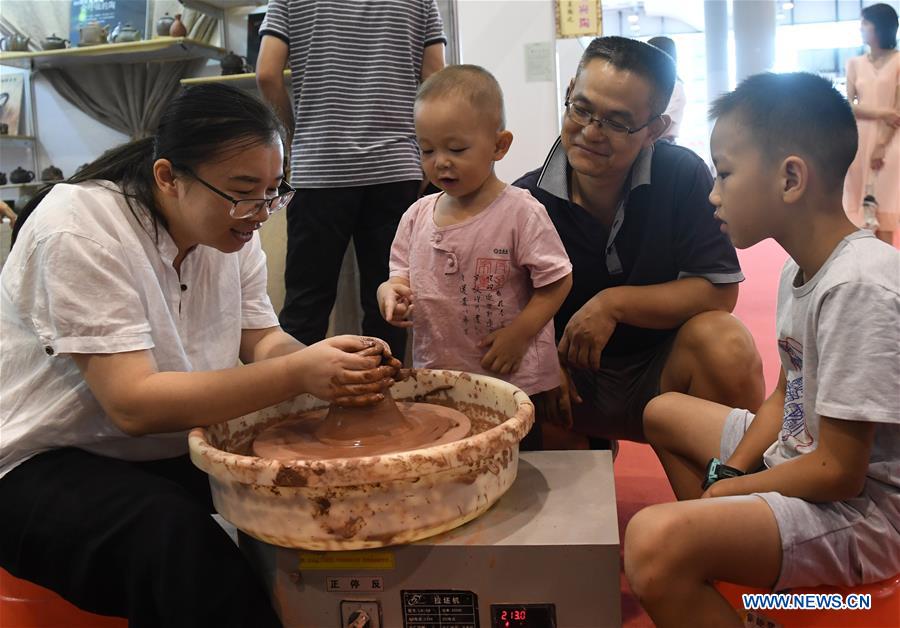 Visitors experience pottery-making at Nanning International Convention and Exhibition Center in Nanning, south China's Guangxi Zhuang Autonomous Region, Aug. 31, 2019. The four-day exhibition on handicrafts and art works of Guangxi kicked off here on Friday, with about 20,000 art works from more than 500 enterprises, universities, institutions and individuals being displayed. (Xinhua/Lu Boan)
