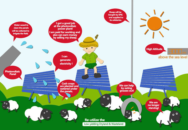 Back in 2014, a subsidiary company of the State Power Investment Corporation creatively planted seeds of grass under the solar panels in its photovoltaic park in Talatan. The company also recycled the water used to clean the solar panels to irrigate pastures, thus restoring the area into a vast land of green.