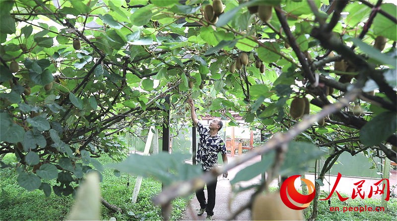 Huang Lianghua checks kiwis in his orchard in Xiuwen County on July 31, 2019. (Photo/ Liu Ning)