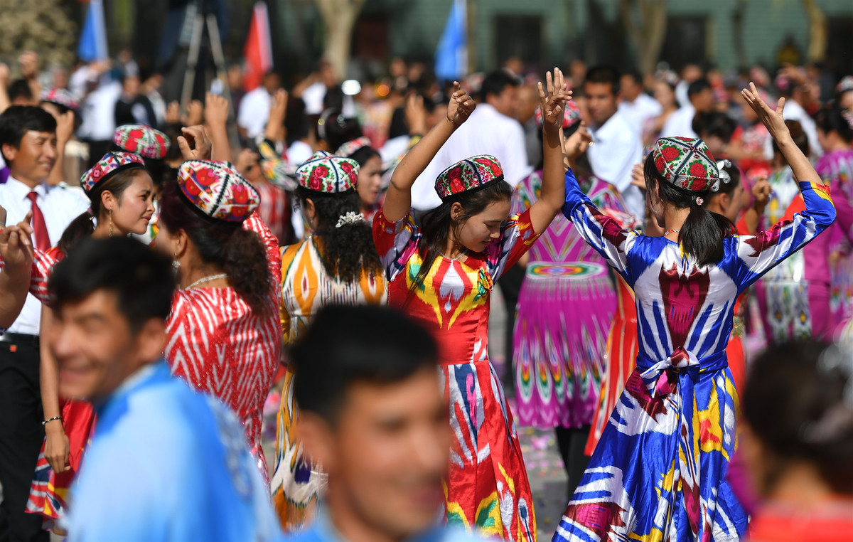 Nearly 10,000 residents dance in local Dolan Maxrap folk style in Awat county in the Xinjiang Uygur autonomous region on Oct 9, 2018. [Photo/China News Service]
