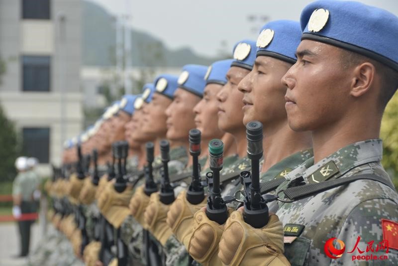 A Chinese peacekeeping squad trains for the military parade. The peacekeeping force will make a debut at this year's military parade. (People's Daily Online/Huang Zijuan)