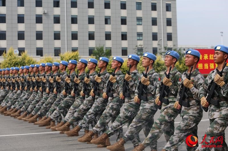 A Chinese peacekeeping squad trains for the military parade. The peacekeeping force will make a debut at this year's military parade. (People's Daily Online/Wang Zhengqi)