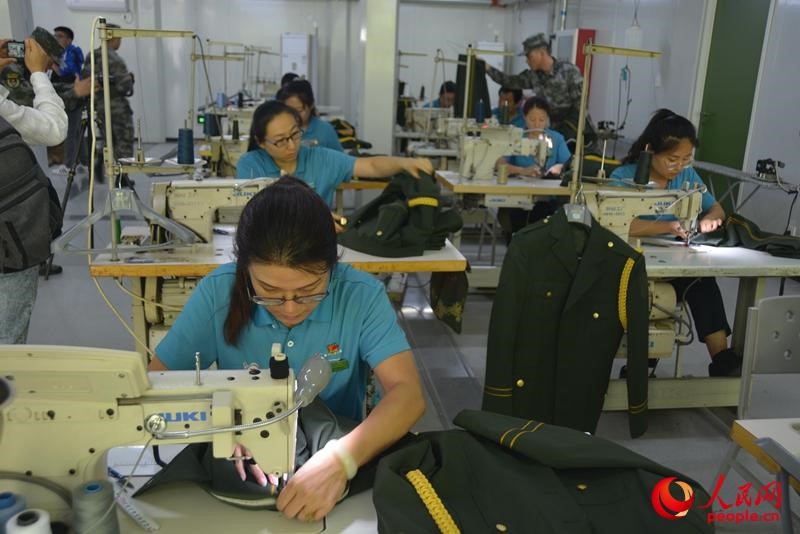Workers make the formal dress that the soldiers wear at the parade. (People's Daily Online/Huang Zijuan)