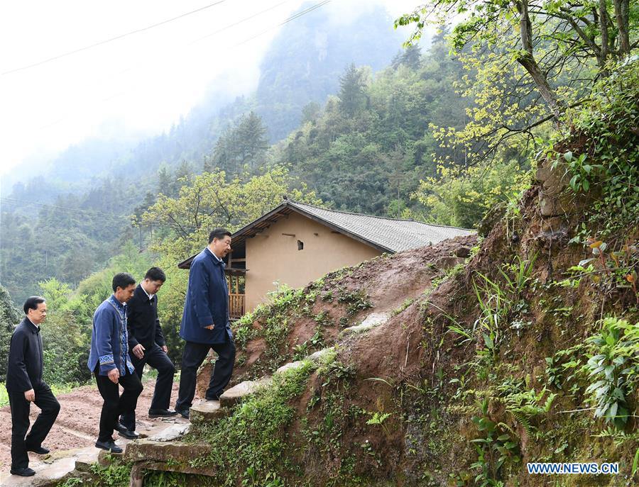 Xi Jinping walks to the house of Tan Dengzhou, an impoverished villager, in Huaxi Village of Shizhu Tujia Autonomous County, southwest China's Chongqing, April 15, 2019. (Xinhua/Xie Huanchi)