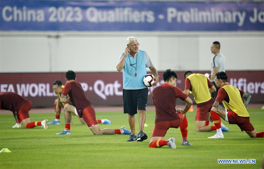 China's head coach Marcello Lippi (C) attends the training session one day ahead of the group A second round match between China and Guam at the FIFA World Cup Qatar 2022 and AFC Asian Cup China 2023 Preliminary Joint Qualification in Guangzhou, capital of south China's Guangdong Province, Oct. 9, 2019. (Xinhua/Ding Xu)
