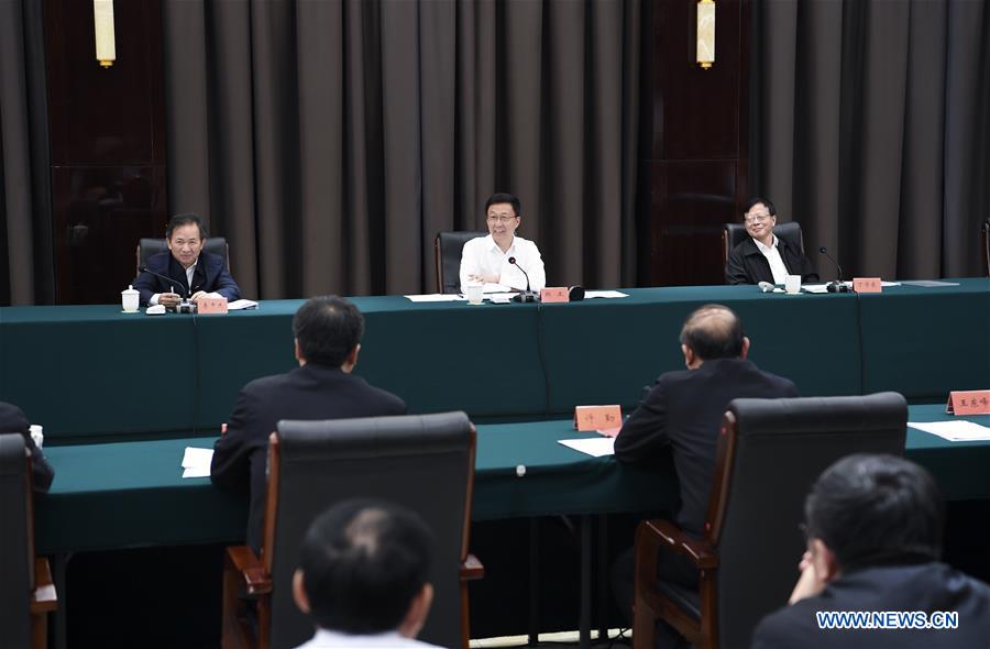 Chinese Vice Premier Han Zheng, also a member of the Standing Committee of the Political Bureau of the Communist Party of China Central Committee, presides over a meeting during his research trip in Xiongan New Area, north China's Hebei Province, Oct. 9, 2019. (Xinhua/Zhang Ling)
