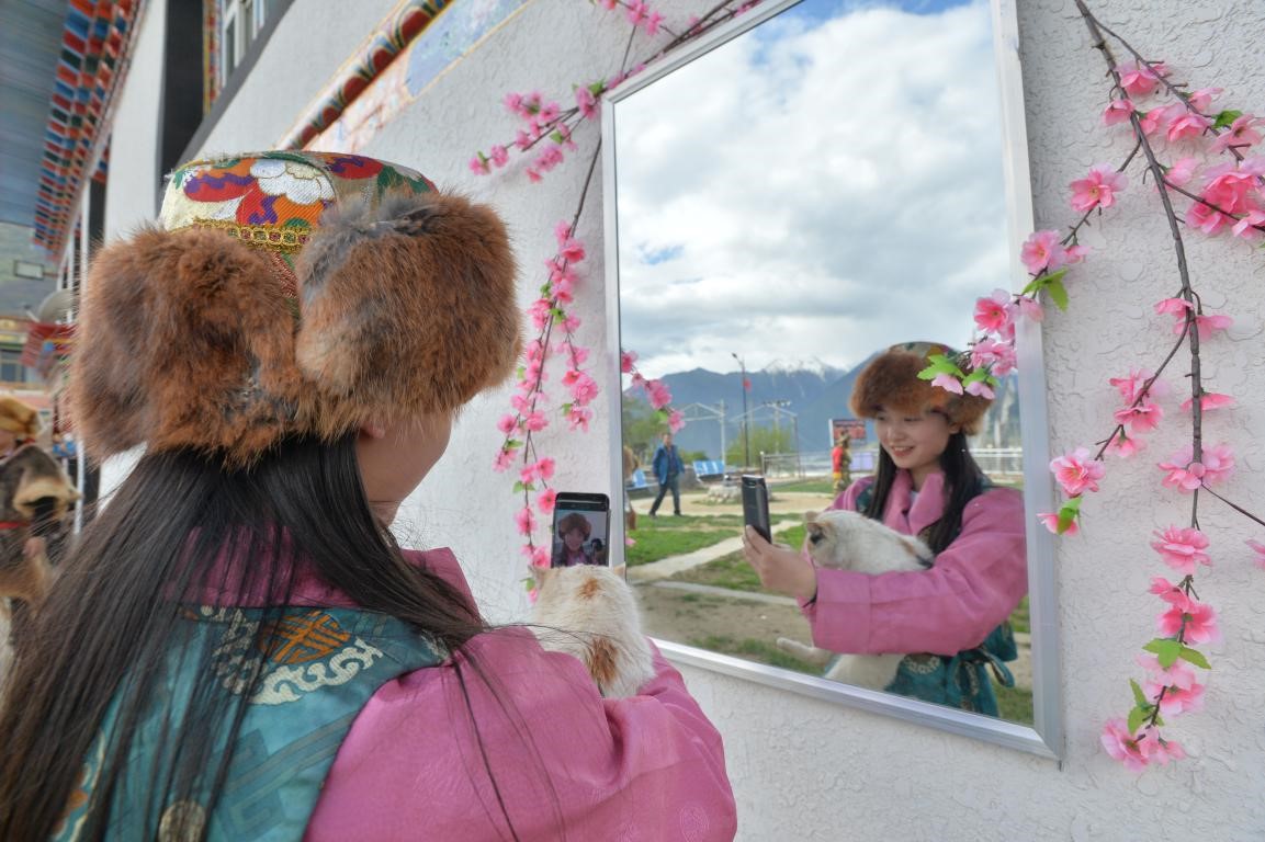 Photo taken on May 18, 2019 shows a visitor in traditional Tibetan costume takes photos at a homestay in Suosong village, Paizhen township, Milin county, Nyingchi city of southwest China’s Tibet Autonomous Region. (Photo by Qiao Qiming/People’s Daily Online)