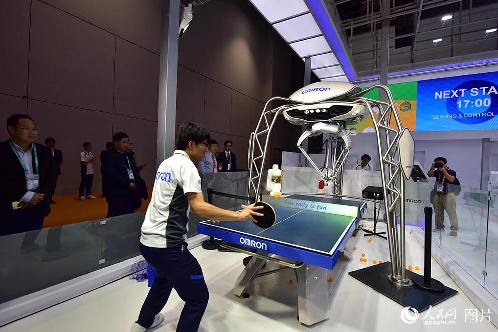 A man plays table tennis with a robot developed by Omron, a Japanese electronics company, at the first CIIE. (Photo/Weng Qiyu, People’s Daily Online)