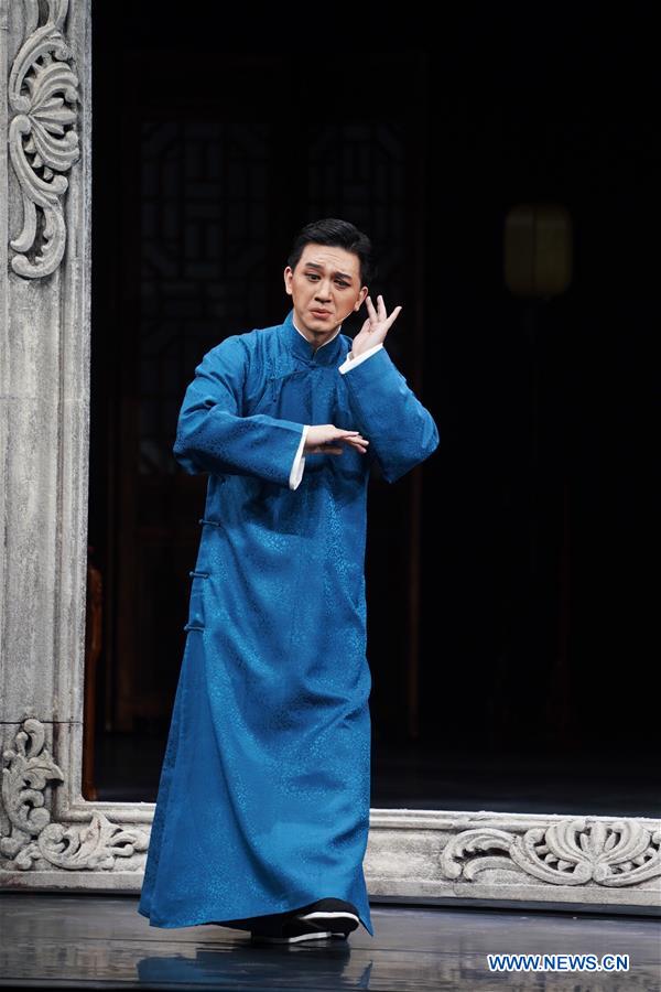 A performer acts in a modern Peking opera show depicting the story of Peking opera master Mei Lanfang in Nanjing, capital of east China's Jiangsu Province, Oct. 22, 2019. (Xinhua/Ji Chunpeng)