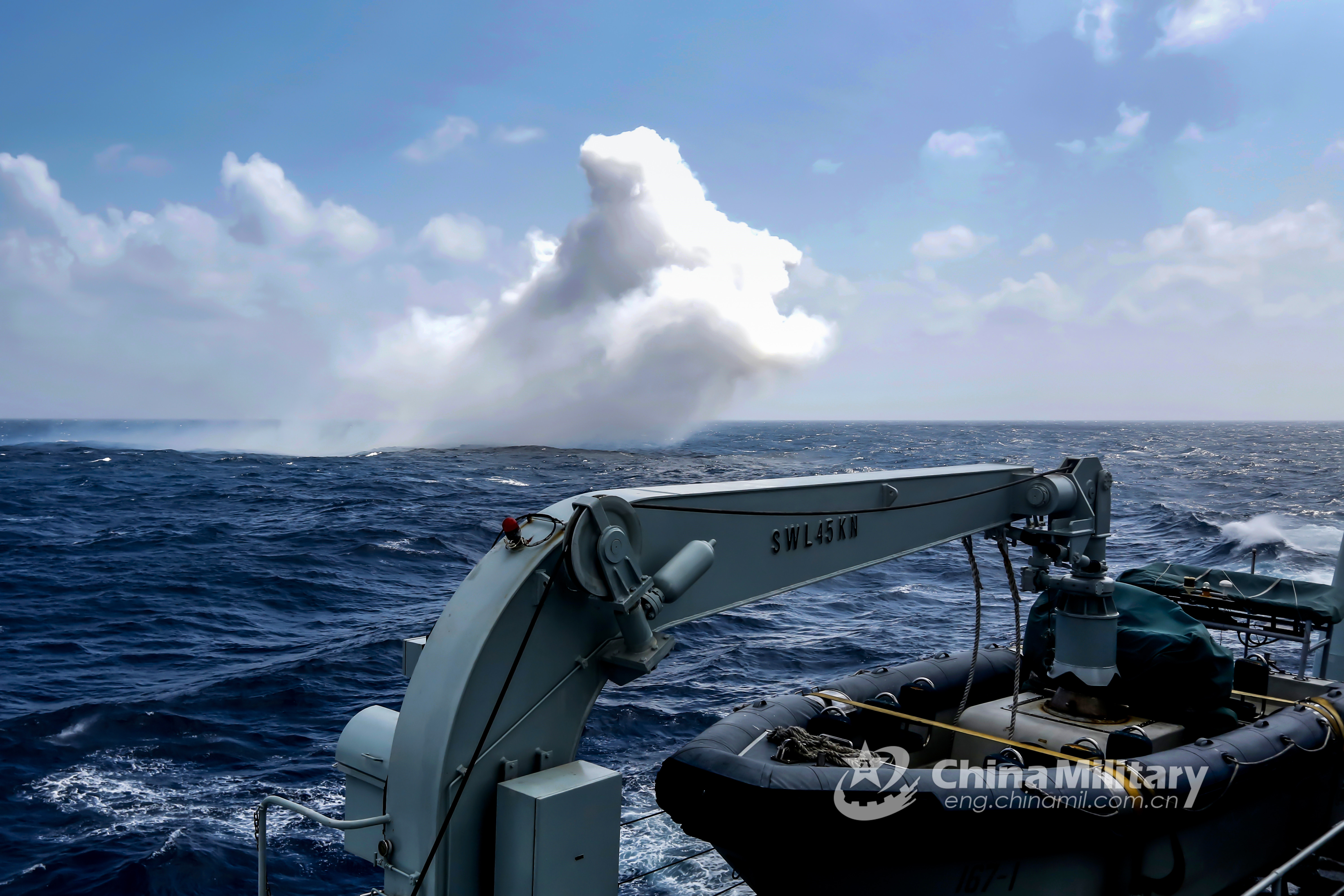 A chaff cloud for concealing the guided-missile destroyer Hohhot (Hull 161) from anti-ship missiles is formed during a maritime real combat training exercise conducted by a destroyer flotilla with the navy under the PLA Southern Theater Command in mid-October, 2019. (eng.chinamil.com.cn/Photo by Xu Guang,Li Wei and Wu Kangci)