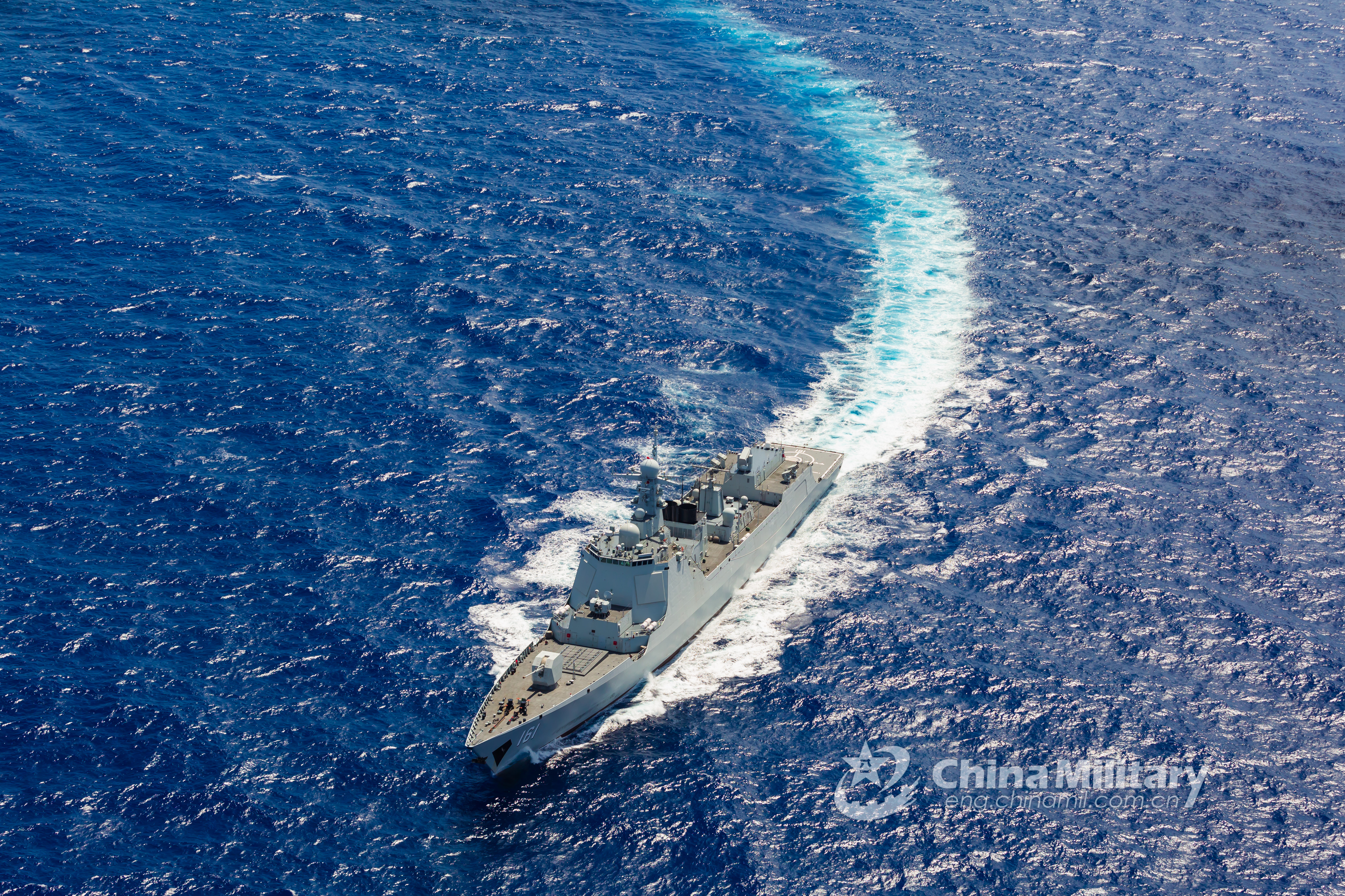 The guided-missile destroyer Hohhot (Hull 161) attached to a destroyer flotilla with the navy under the PLA Southern Theater Command steams in speed to occupy a vantage position in waters of the South China Sea during a maritime real combat training exercise in mid-October, 2019. (eng.chinamil.com.cn/Photo by Xu Guang,Li Wei and Wu Kangci)