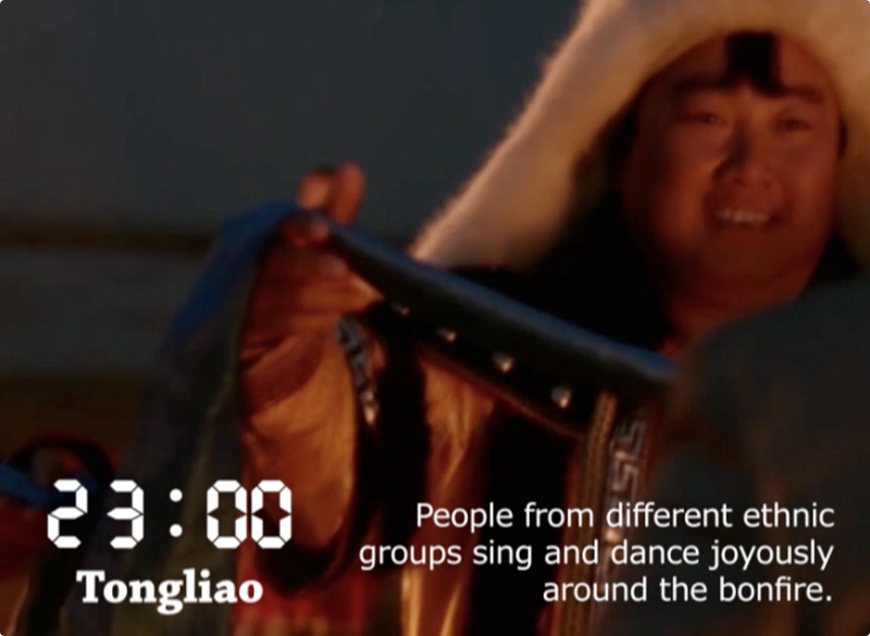 People from different ethnic groups sing and dance joyously around the bonfire.