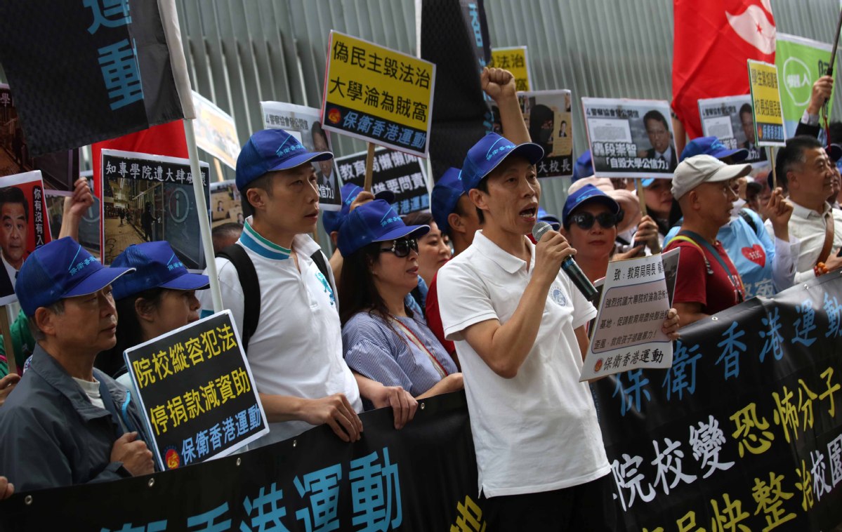 Members of Defend Hong Kong Campaign group stage a rally outside Hong Kong government headquarters on Tuesday against higher education institutions for abetting students using violence. Photo provided to China Daily