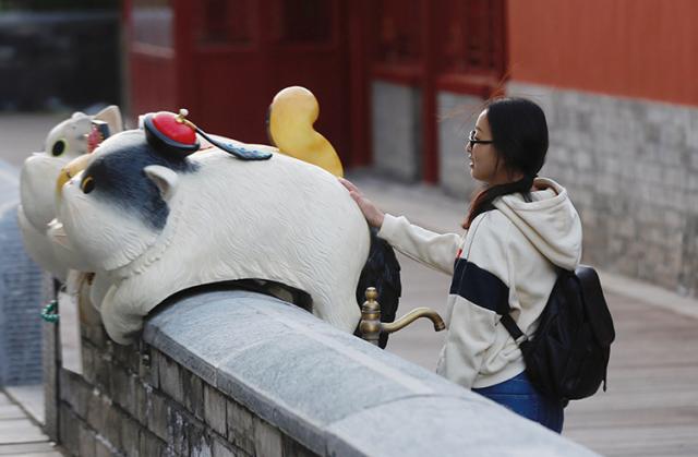 Giant statues of cats, dressed as imperial guards of the Ming and Qing Dynasties, sit near the gate of divine prowess at Beijing’s Palace Museum. Large groups of visitors take pictures with these adorable “royal cats” on Oct. 28, 2019. (The Beijing News/Li Kaixiang)