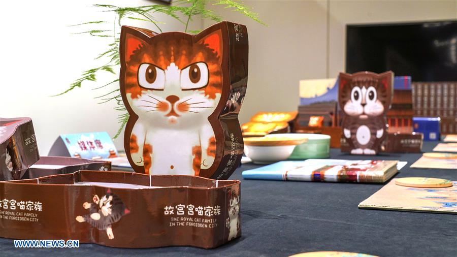 Photo taken on Nov. 4, 2019 shows "the Royal Cat Family in the Forbidden City" themed cultural creations in Beijing, capital of China. A series of cultural creations featuring "the Royal Cat Family in the Forbidden City", which are based on cats living in the Forbidden City, will meet the public late December. (Xinhua/Ma Xiaodong)