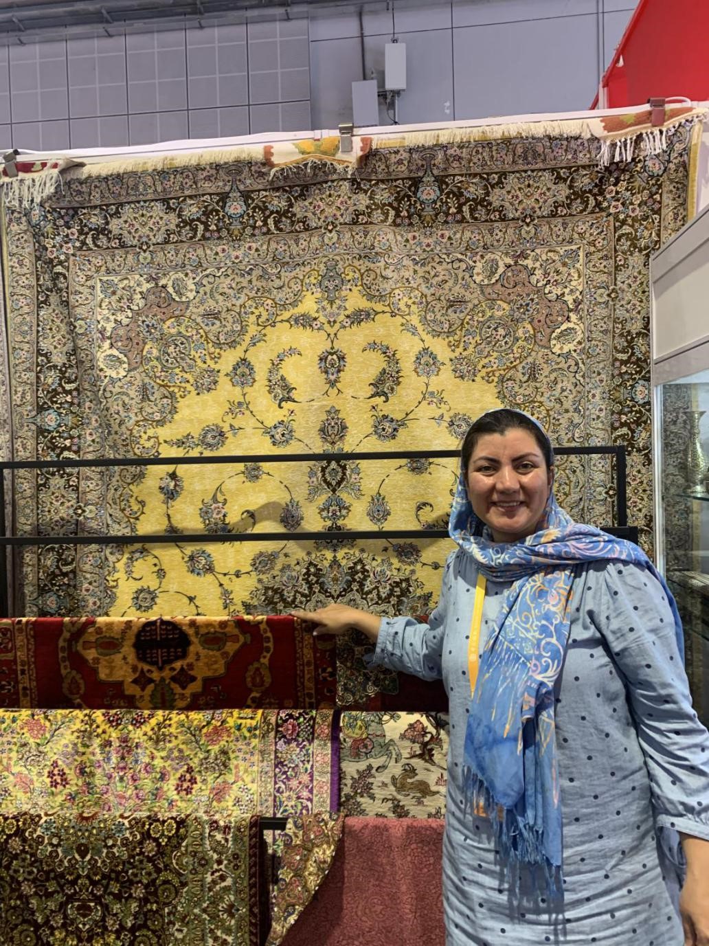 At the lifestyles exhibition area of the second CIIE, a woman from Iran shows hand-made Persian carpets produced by her factory. (Photo by Wang Hui from People’s Daily)