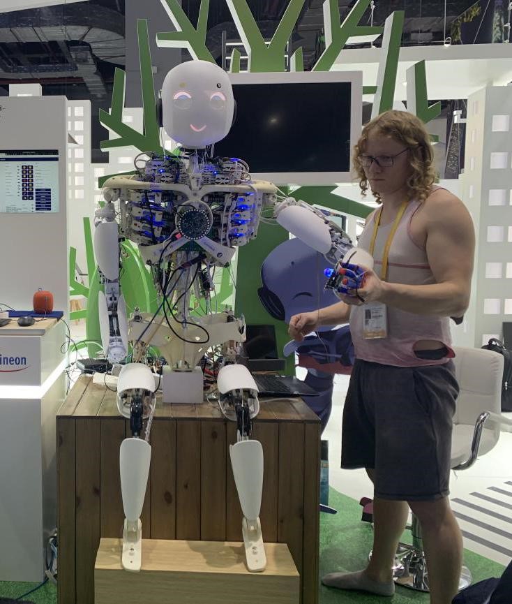 A staff member tests Roboy, a humanoid robot, at the booth of Infineon Technologies at the second CIIE. (Photo by Wang Hui from People’s Daily)