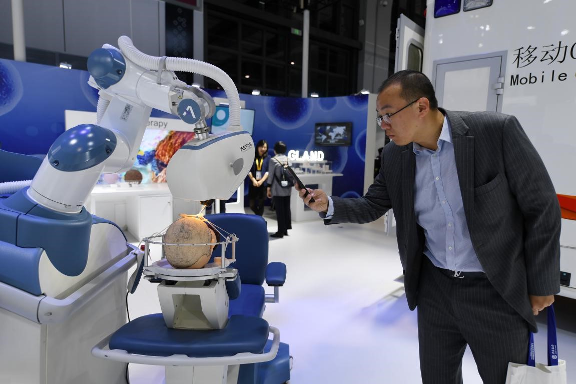 A visitor takes photo of a hair transplant robot at the second CIIE. (Photo by Weng Qiyu from People’s Daily)