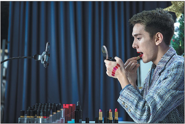 Li Jiaqi, a Chinese blogger, who endorses beauty products through livestreaming, applies lipstick during a live broadcast on the Taobao platform in Shanghai. Niu Jing / For China Daily