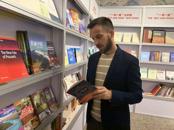 A citizen in Athens reads a book at an exhibition of China-themed books held in 2019 in Athens, Greece. (Photo by Ye Qi/People’s Daily)