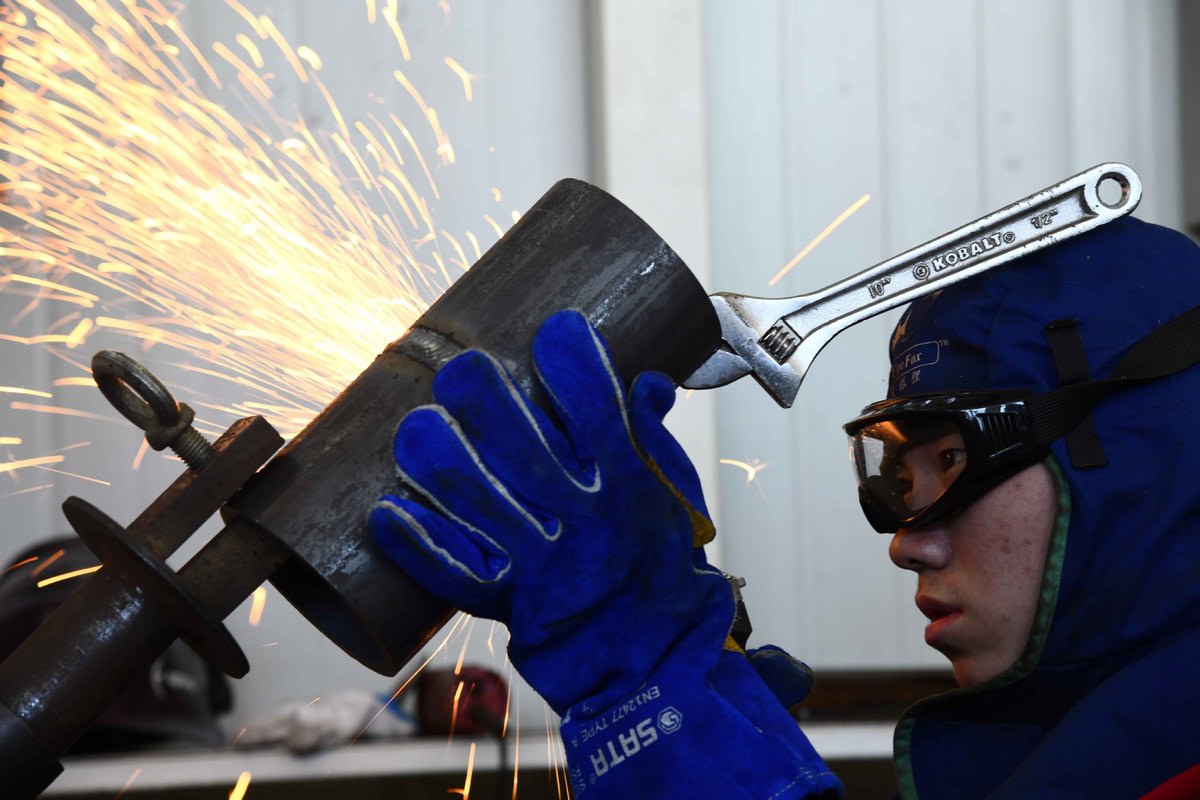 A participant competes in the welding contest at Weihai Vocational College in Weihai city, East China's Shandong province, Nov 11, 2019. [Photo/Xinhua]