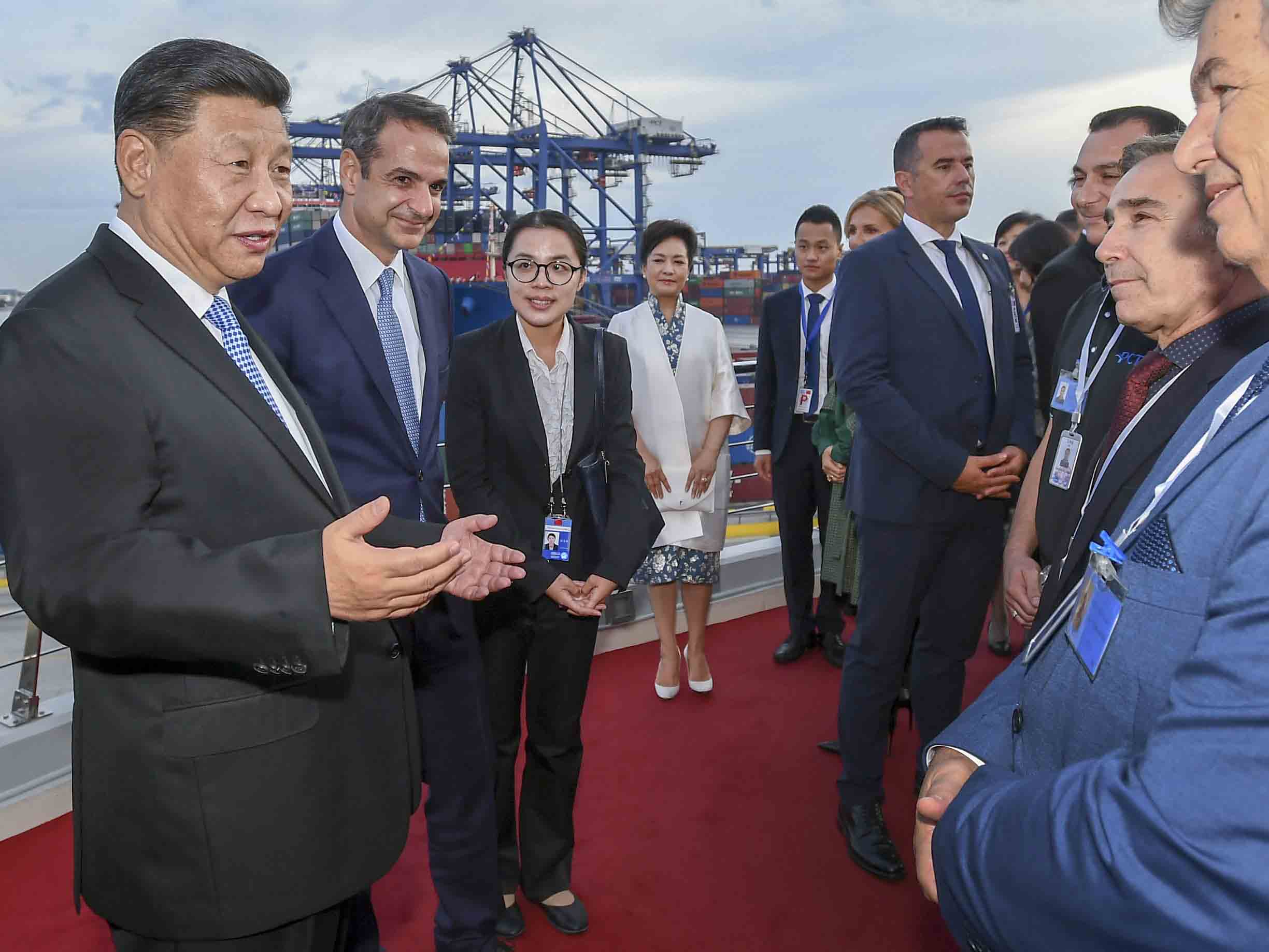 Xi and his wife Peng Liyuan, accompanied by the Greek prime minister and his wife Mareva Grabowski-Mitsotakis, were warmly welcomed by Chinese and foreign employees waving national flags of the two countries upon their arrival at the Piraeus Port.