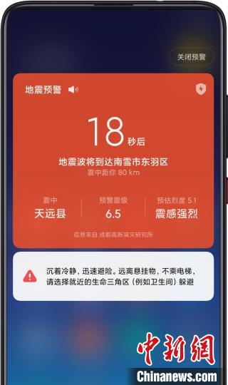 An earthquake warning system co-developed by Chengdu High-tech Disaster Reduction Institute and Chinese tech giant Xiaomi was launched on Xiaomi MIUI 11 and Xiaomi TV, Chinanews.com reported on Nov.19.