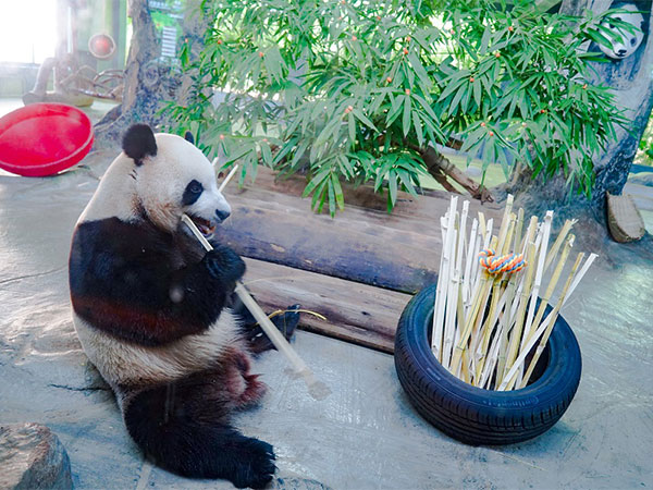 Panda Shun Shun enjoys his food at the Hainan Park. He eats about 20 kilograms of fresh bamboo a day. [Photo by Zhang Jiacheng for chinadaily.com.cn]