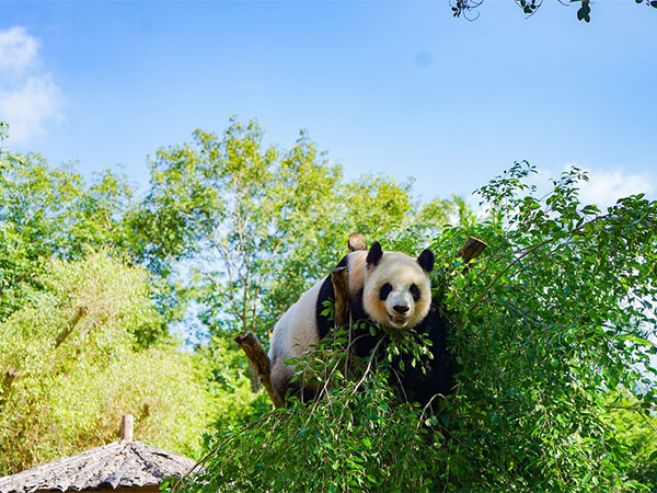 Panda Gong Gong offers a high profile welcome to visitors at Hainan Tropical Wildlife Park. Each of the panda brothers has its own outdoor playground, dotted with a swimming pool, slide, toys and trees. [Photo by Zhang Jiacheng for chinadaily.com.cn]