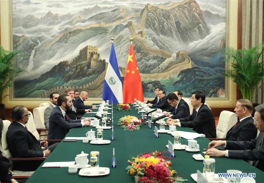 Li Zhanshu, a member of the Standing Committee of the Political Bureau of the Communist Party of China (CPC) Central Committee and chairman of the Standing Committee of the National People's Congress, meets with El Salvador's President Nayib Armando Bukele Ortez in Beijing, capital of China, Dec. 4, 2019. (Xinhua/Liu Weibing)