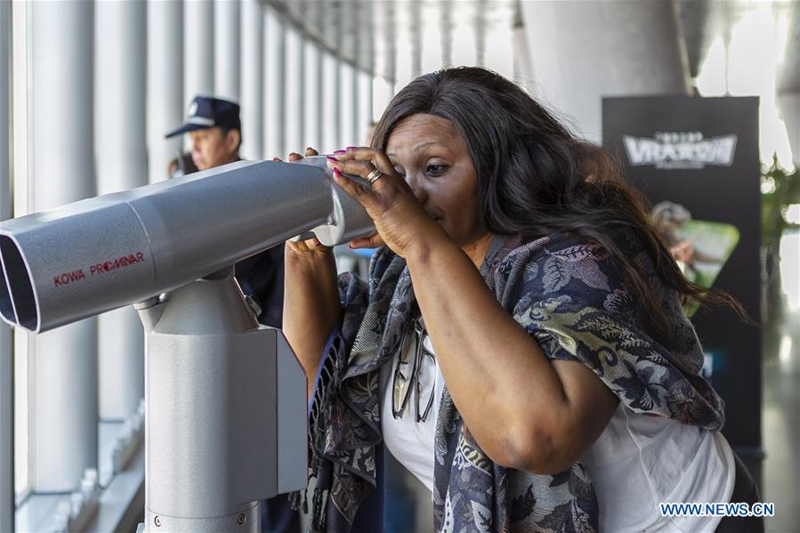 A participant enjoys the city view from the Shanghai Tower in Shanghai, east China, Dec. 7, 2019, before attending the upcoming 2019 South-South Human Rights Forum. (Photo by Wang Xiang/Xinhua)